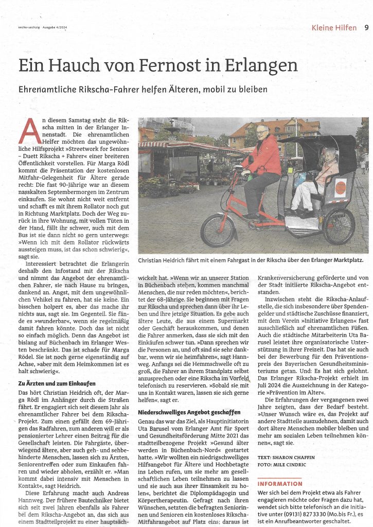In der Kategorie „Prävention im Alter“ wurde das kostenlose Rikscha-Mitfahr-Angebot für Ältere in Büchenbach ausgezeichnet. Link zur Veröffentlichung